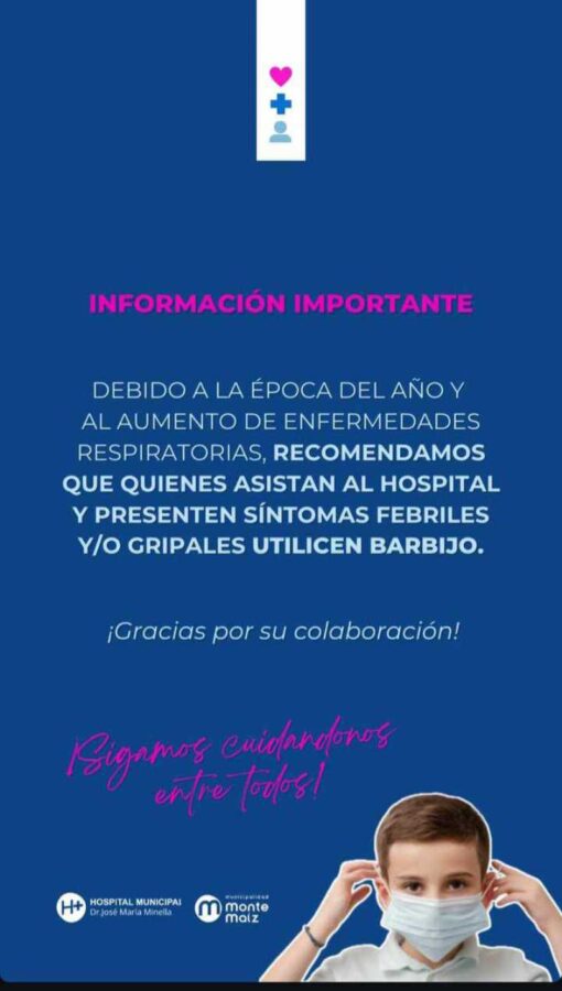 Desde el Hospital municipal, Dr. José María Minella se recomienda extremar las medidas de prevención para evitar las enfermedades respiratoias, propias dela época. Se pide además a quienes asistan al nosocomio local y que presenten síntomas febriles y/o gripales, que lo hagan con barbijo.