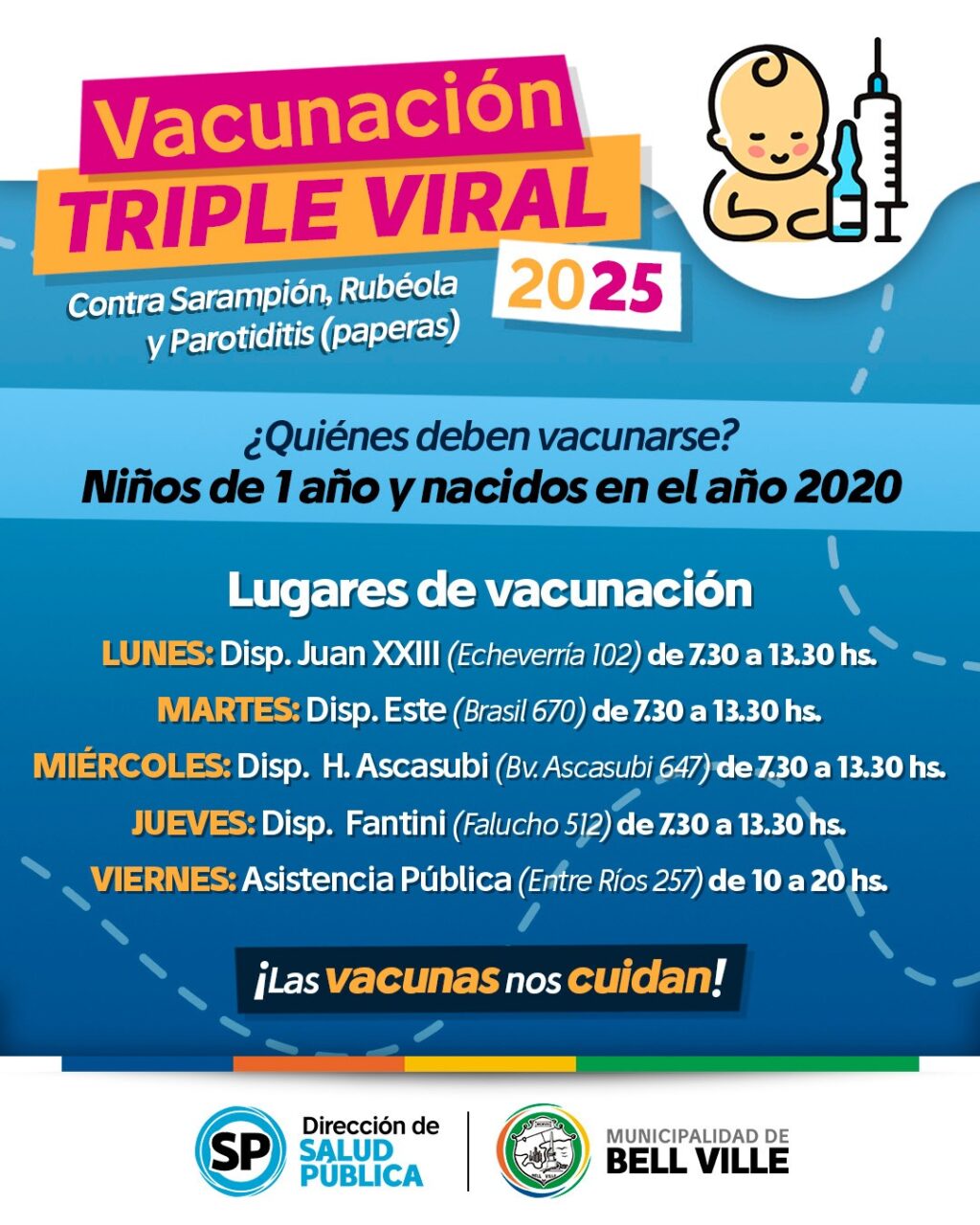ZONA UNIÓN Bell Ville /// Vacuna Triple Viral 3 meses atrás Hoy Noticias CBA Vacunación Triple Viral contra sarampión, rubéola y paperas ¿Quiénes deben vacunarse? Niños de 1 año y nacidos en 2020. ¡Las vacunas nos cuidan! Post navigation Anterior Ballesteros /// El Ballet Folklórico a un paso de participar en el Teatro Real de CórdobaSiguente Bell Ville /// Talleristas del Programa Núcleos Barriales Culturales celebran sus vínculos
