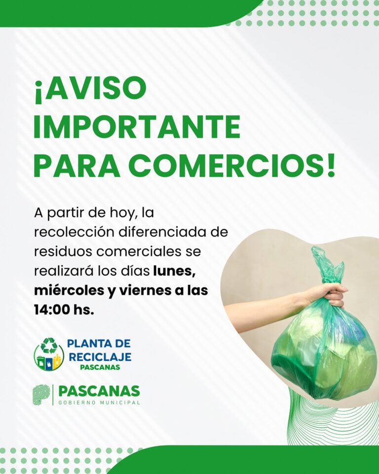 Aviso importante a los comercios A partir de hoy, la recolección diferenciada de residuos comerciales se realizará los días lunes,...