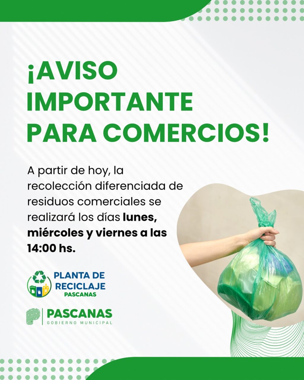 A partir de hoy, la recolección diferenciada de residuos comerciales se realizará los días lunes, miércoles y viernes a las 14:00 hs.