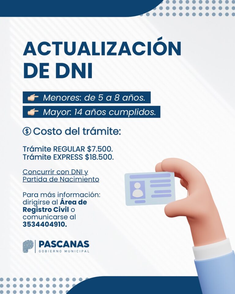 La Municipalidad de Pascanas informa que se encuentra disponible la Actualización de DNI en el Registro Civil local. Menores: de...