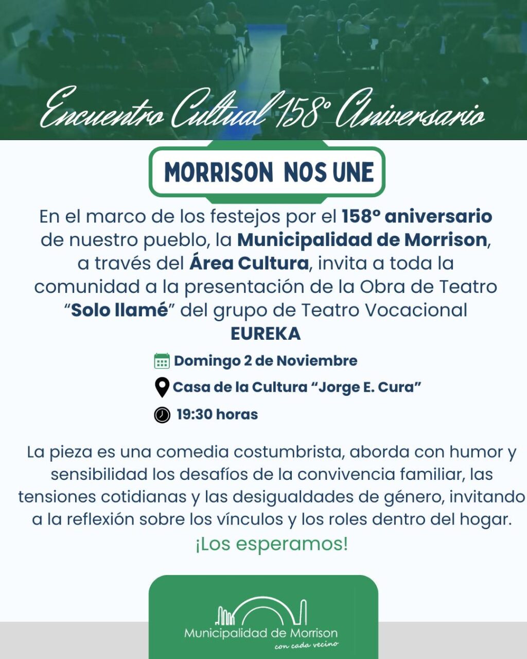 En el marco de los festejos por el aniversario de nuestro pueblo, invitamos a disfrutar de una 𝐧𝐨𝐜𝐡𝐞 𝐝𝐞 𝐭𝐞𝐚𝐭𝐫𝐨 con la presentación de la obra “𝐒𝐨𝐥𝐨 𝐥𝐥𝐚𝐦𝐞́”, del grupo vocacional 𝐄𝐔𝐑𝐄𝐊𝐀.