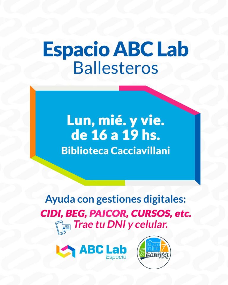 Espacio ABC Lab – Biblioteca Popular José E. Cacciavillani (Ballesteros) Lunes, miércoles y viernes de 16 a 19 hs. Te...