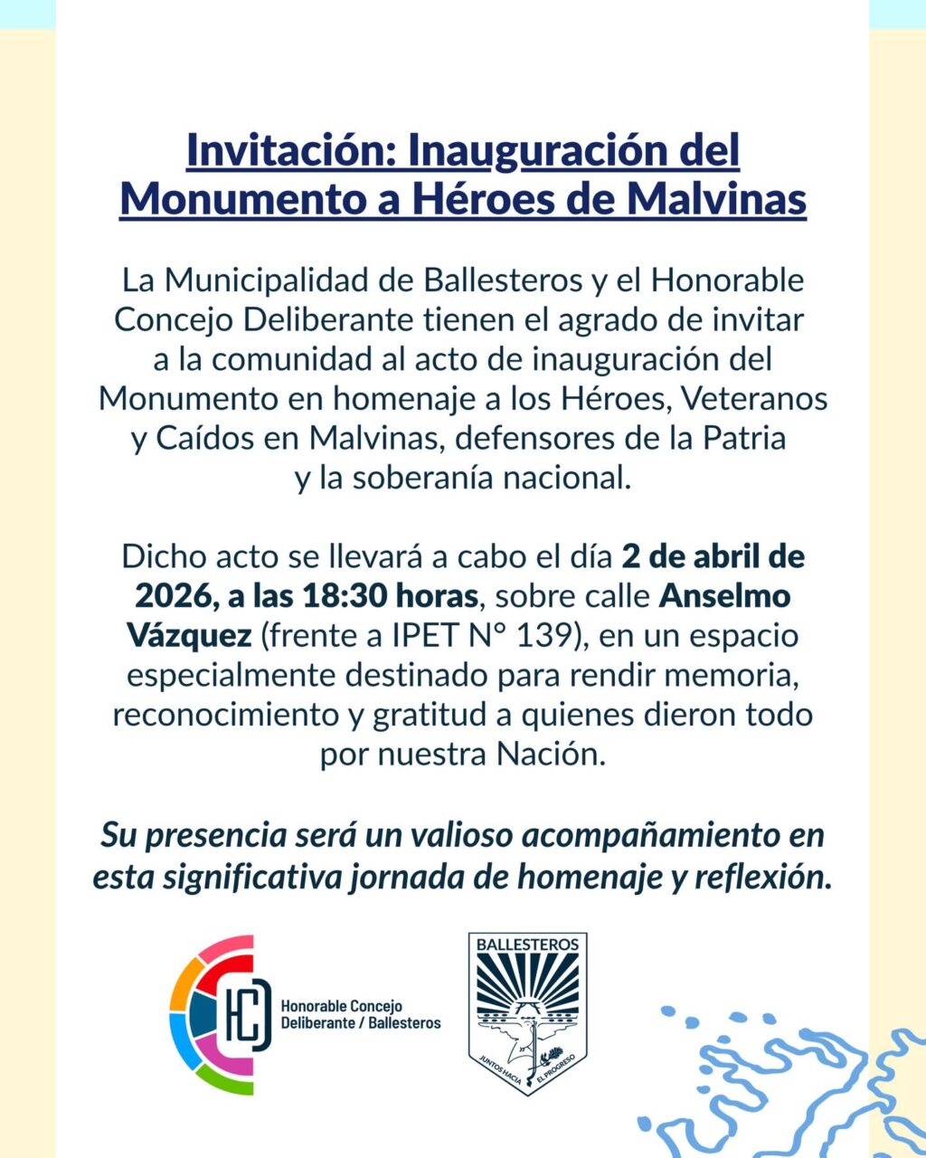La Municipalidad de Ballesteros y el Honorable Concejo Deliberante invitan a toda la comunidad al acto de inauguración del monumento en homenaje a los Héroes, Veteranos y Caídos en Malvinas.